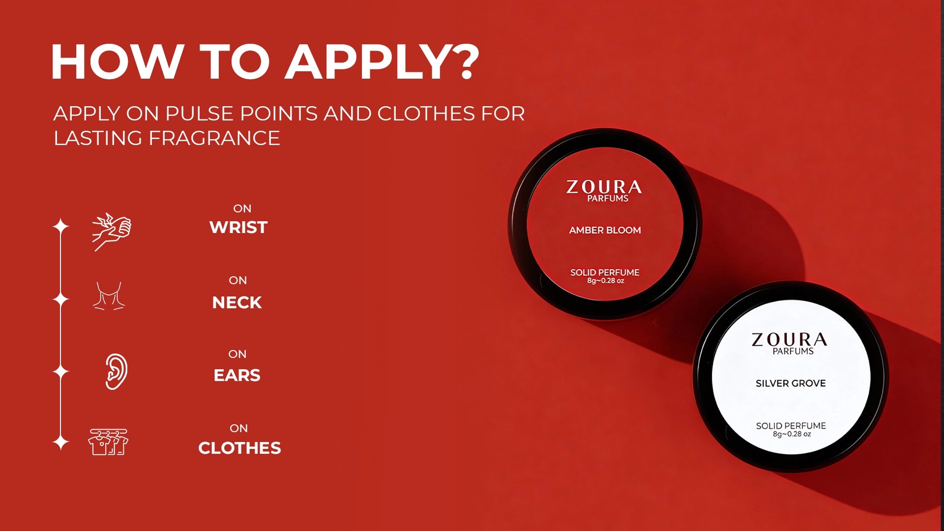 Apply a small amount to pulse points such as wrists, neck, and behind the ears. Body heat helps diffuse the fragrance gradually.